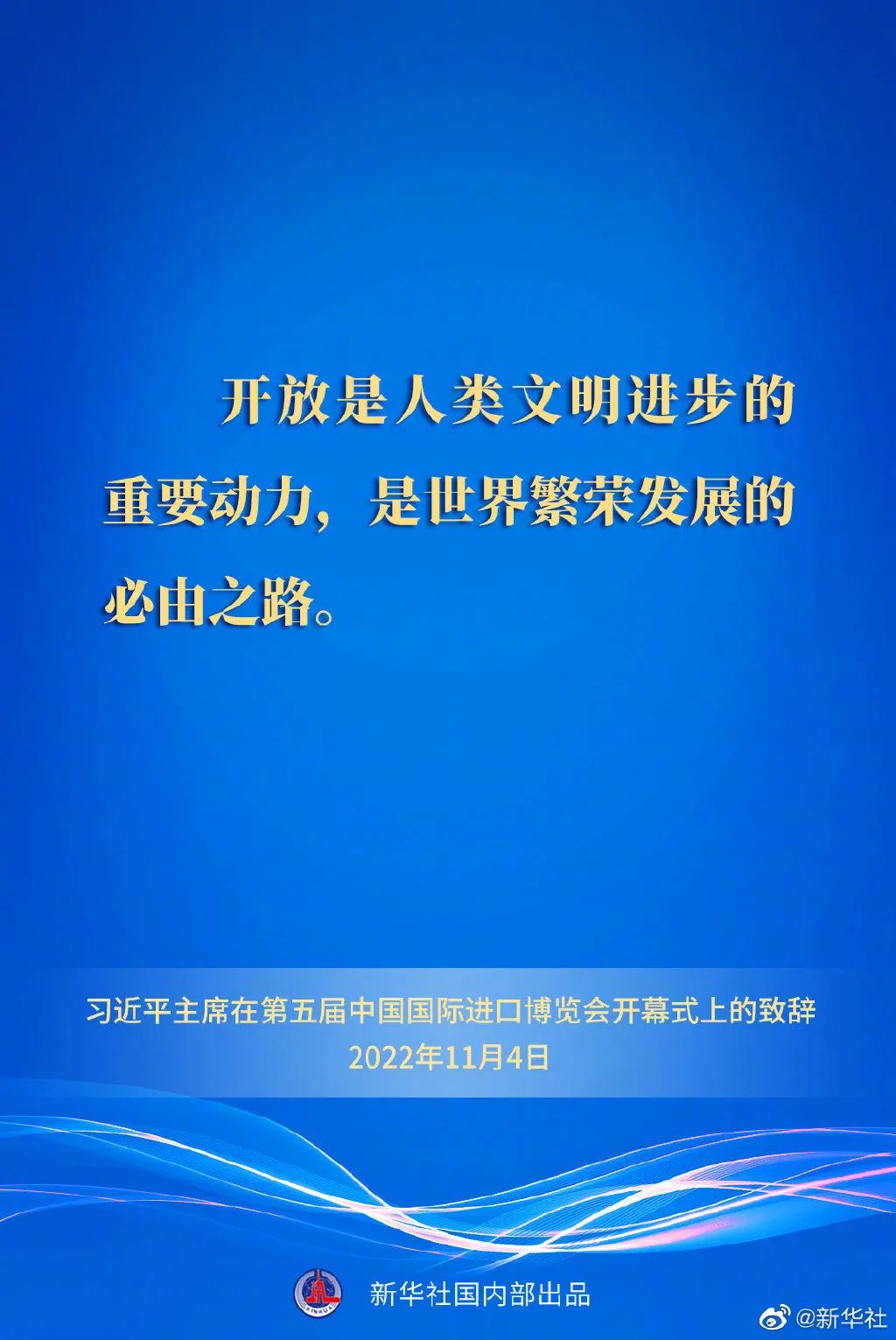 11月4日晚,国家主席习近平以视频方式出席在上海举行的第五届中国国际进口博览会开幕式并发表题为《共创开放繁荣的美好未来》的致辞。