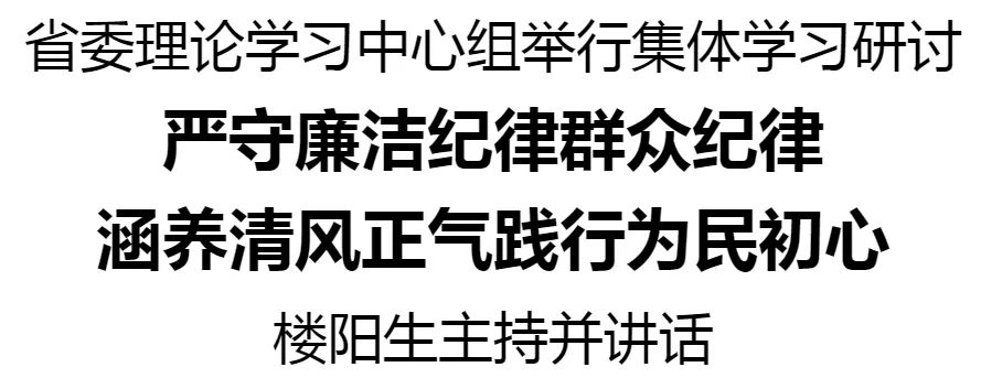 6月7日,省委理论学习中心组举行集体学习研讨,继续深入学习《中国共产党纪律处分条例》,重点围绕廉洁纪律、群众纪律进行研读。省委书记楼阳生主持并讲话。