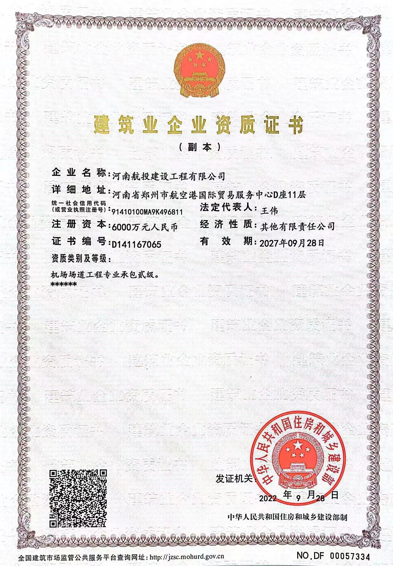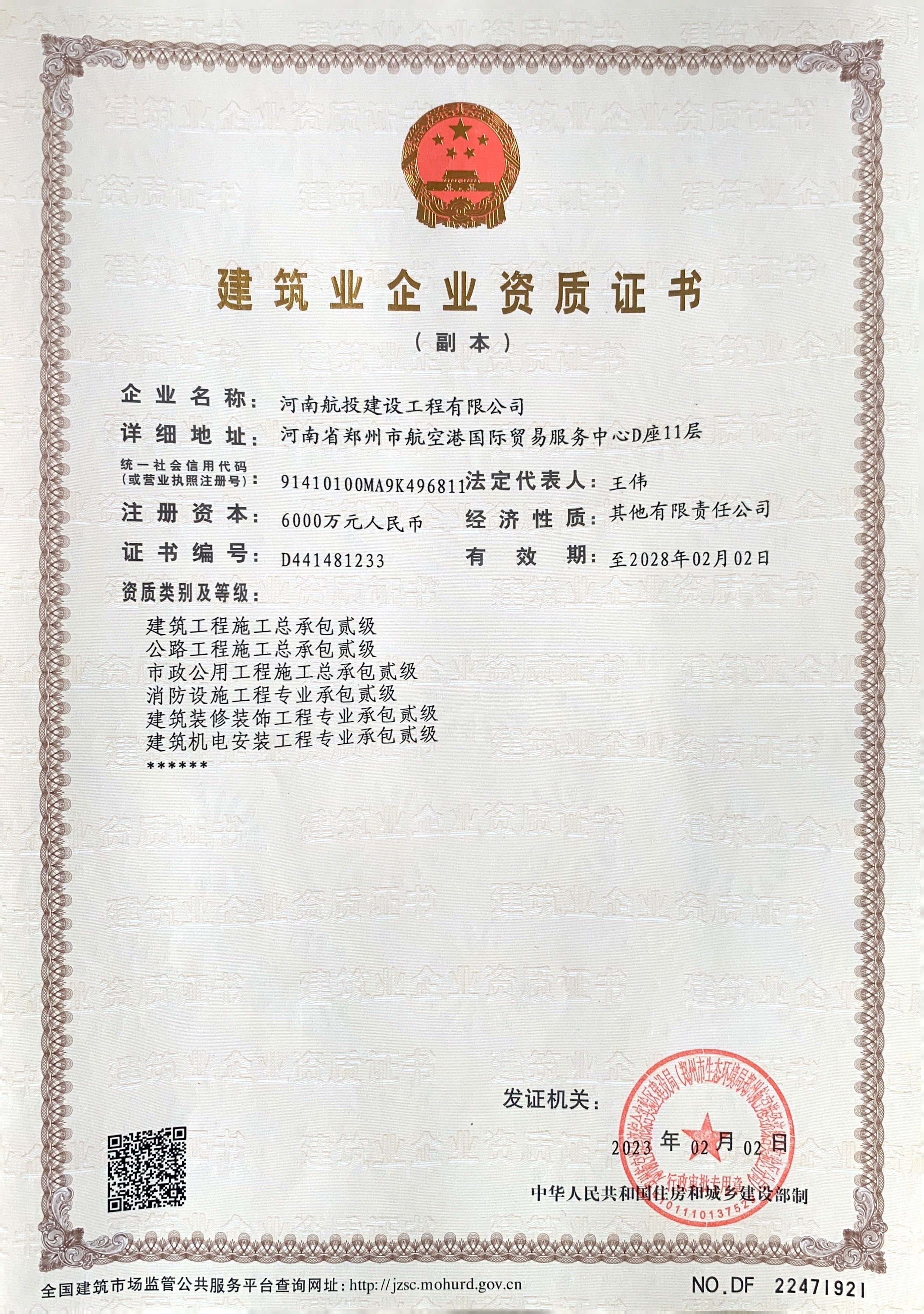 随着新资质的取得,航投建工成为河南省第一家以机场场道工程、民航空管及机场弱电系统工程、目视助航工程为主业,同时配套拓展市政公用、公路、房屋建筑、钢结构工程等施工领域的专业化国有施工企业。