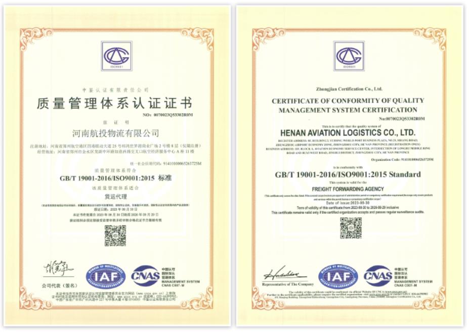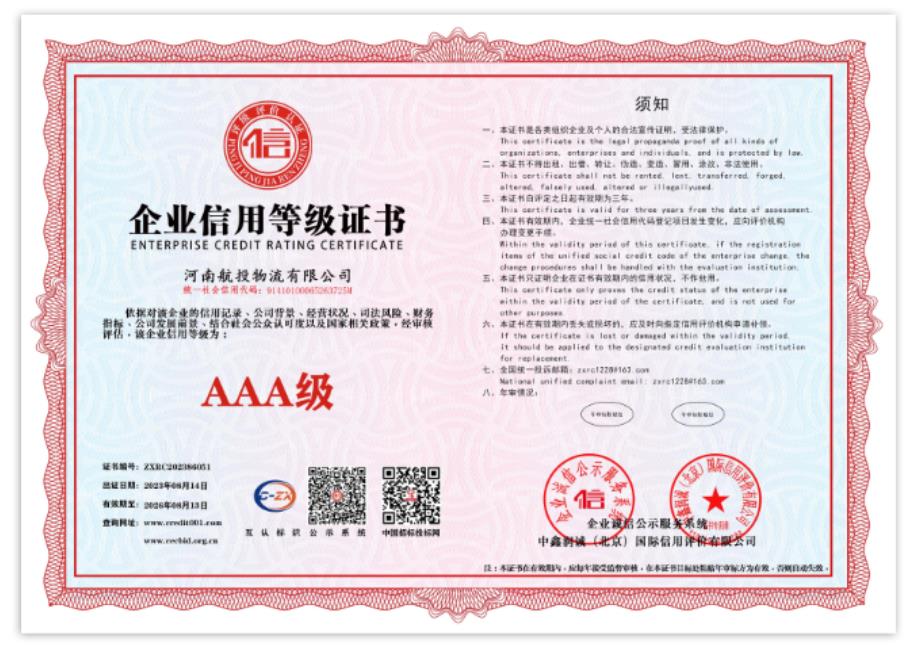 近日,航投物流通过GB/T 19001-2016/ISO 9001:2015质量管理体系认证审核,荣获ISO质量管理体系认证证书,同时获得了企业信用的最高评定——AAA级企业信用等级证书,被授予“十证一牌”。喜获双重肯定,意味着航投物流在行业综合竞争中迈上新台阶,是对其高效业务流程、标准化经营、规范化管理模式的肯定。