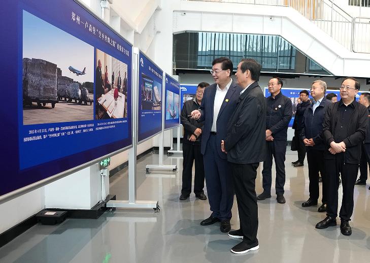 在位于郑州航空港区的航投培训中心,刘奇葆首先参观了“郑卢‘空中丝绸之路’的探索与实践”图片展。张明超详细介绍了35张图片背后的故事和内涵,汇报了“一带一路”框架下郑卢“空中丝路”的建设历程和发展现状。