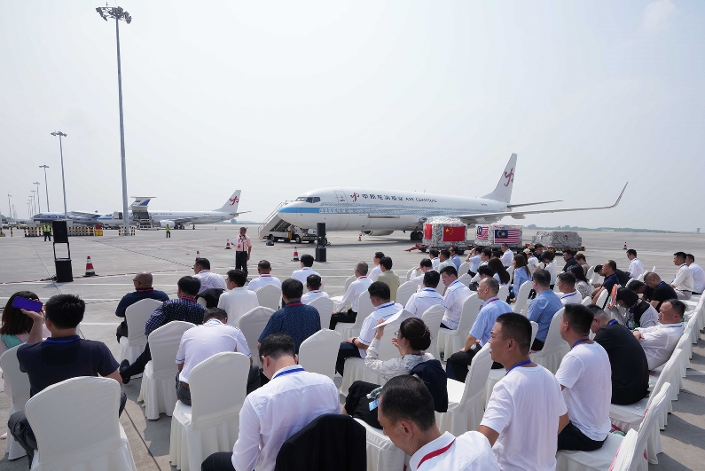 8月25日上午,吉隆坡-郑州鲜食榴莲首航接机仪式在郑州机场举行,马来西亚首批鲜食榴莲进入中国市场,中马航空货运枢纽项目加速推进。中豫航空集团党委书记、董事长张明超,总经理、党委副书记、副董事长柳建民;马来西亚驻华大使馆工作人员,马来西亚榴莲厂商公会代表和榴莲贸易供应链企业代表参加了仪式。