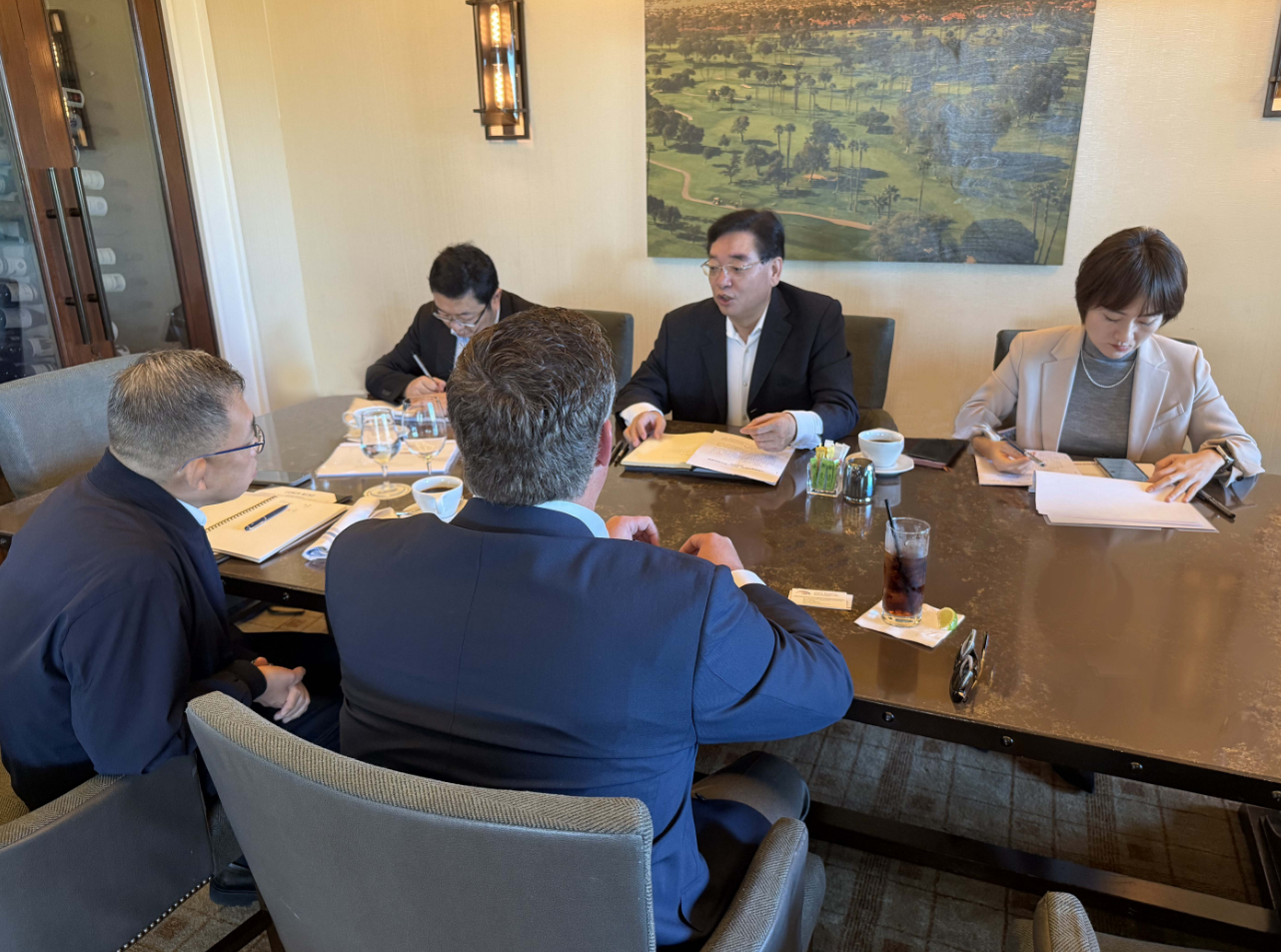 11月22日,代表团一行在洛杉矶与Wallace销售副总裁Bryan会谈,美国康尼航空相关业务负责人一同参加。张明超介绍了中豫航空集团简况和郑州机场当前业务布局。他表示,在Wallace的促成下,美国康尼航空今年在郑货运量增幅超过50%,与郑州机场货量同步达到历史峰值,物流服务集成商、航空公司、枢纽机场三方资源叠加,实现了优势互补和共赢发展,希望Wallace和美国康尼航空进一步拓展在郑业务,加强与中原龙浩航空等本土货运航空公司的合作,中豫航空集团将一如既往给予支持。Bryan表示,今年5月,Wallace与美国康尼航空开通了郑州机场首条直飞亚特兰大/达拉斯的国际定期货运航线并顺利运营至今,为各方发展提供了支持。目前,郑州机场已经成为美国康尼航空在中国大陆投放运力最多的机场,Wallace希望能继续与中豫航空集团保持良好的合作关系,并将根据市场需求适时增加在郑运力。