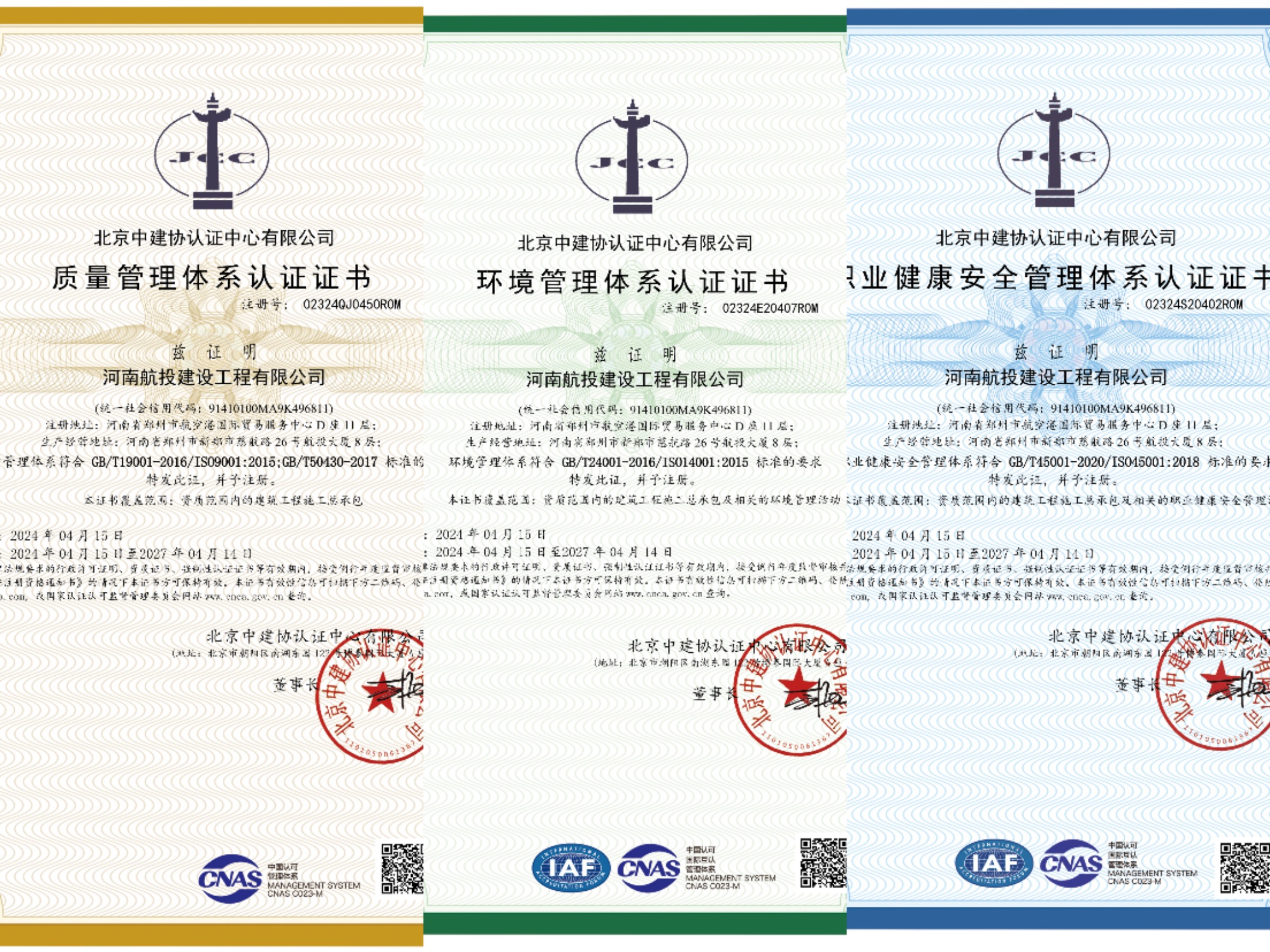 4月15日,河南航投建设工程有限公司(以下简称航投建工)通过ISO9001质量管理体系、ISO14001环境管理体系、ISO45001职业健康安全管理体系(以下简称ISO三体系)认证并获得证书,这标志着航投建工的规范化标准化管理迈上新台阶,为持续提升市场竞争力、拓展合作新领域打下坚实基础。