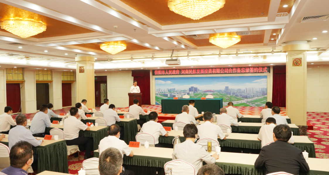 9月10日,河南民航发展投资有限公司与信阳市人民政府在信阳市行政中心签约,以项目为抓手,就发展航空产业、推动信阳革命老区振兴展开全面合作。信阳市委书记王东伟,市委副书记、市长蔡松涛,河南航投党委书记、董事长张明超,总经理、党委副书记、副董事长刘建葆,以及信阳市委常委、市委秘书长杨进,副市长吕旅,市政府秘书长张全胜,河南航投副总经理谢亚伟、乔长恩参加仪式。双方在签约前进行了座谈,张明超与蔡松涛在仪式上分别致辞。