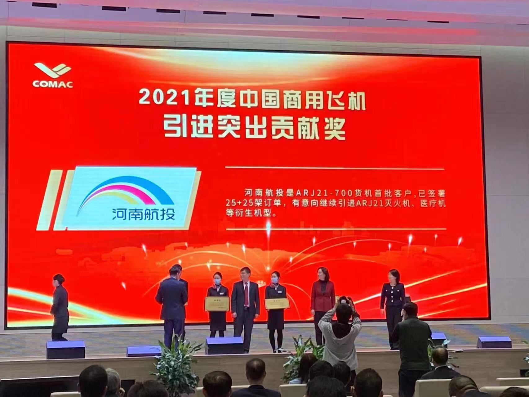 10月26日,中国商飞2022年度客户大会在嘉兴召开。会上颁发了第一届中国商用飞机“翱翔奖”。由中国商飞党委书记、董事长贺东风为河南航投颁发“翱翔奖—— 2021年度中国商用飞机引进突出贡献奖”,这是中国商飞首次将国产商用飞机相关奖项授予河南本土企业,对国产货机进一步拓展市场具有重要意义。