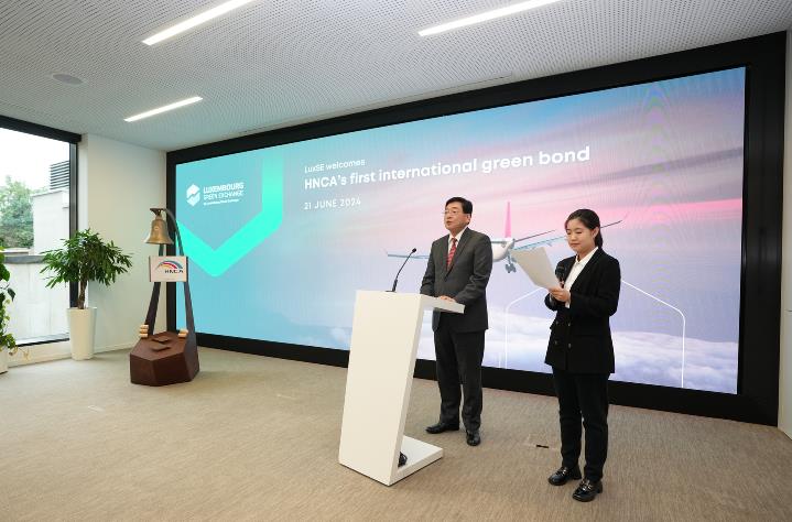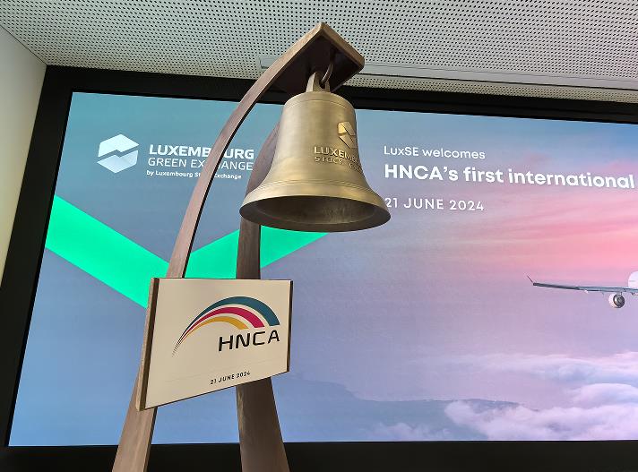 当地时间6月21日上午,中豫航空集团以河南航投为主体发行的3年期人民币境外债券上市仪式在卢森堡证券交易所举行。这是中国企业在欧洲发行的首支支持可持续航空燃料(SAF)的绿色债券,也是河南企业发行的首支离岸人民币绿色债券,郑卢“空中丝路”资金融通实现新突破。