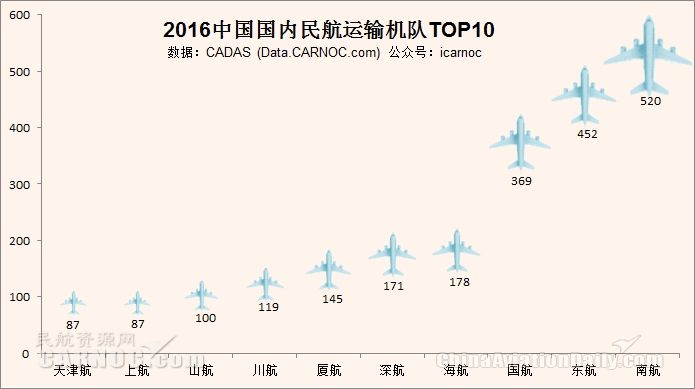 在航空公司中,东航引进的飞机最多,为52架,国航36架、南航32架。
