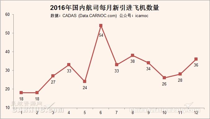 2016全年共引进飞机369架,其中12月份新引进飞机36架,6月份引进数量最多,达到54架。