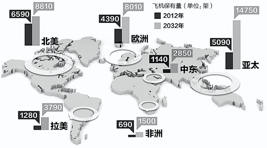 据《费加罗报》报道,中产阶层占全球人口比例将由2012年的30%上升至20年后的60%,其中亚太地区增长尤其迅猛,中产阶层人口将由2012年的7.46亿上升至2031年的34亿。而亚太地区正是航空市场发展最快的地区。