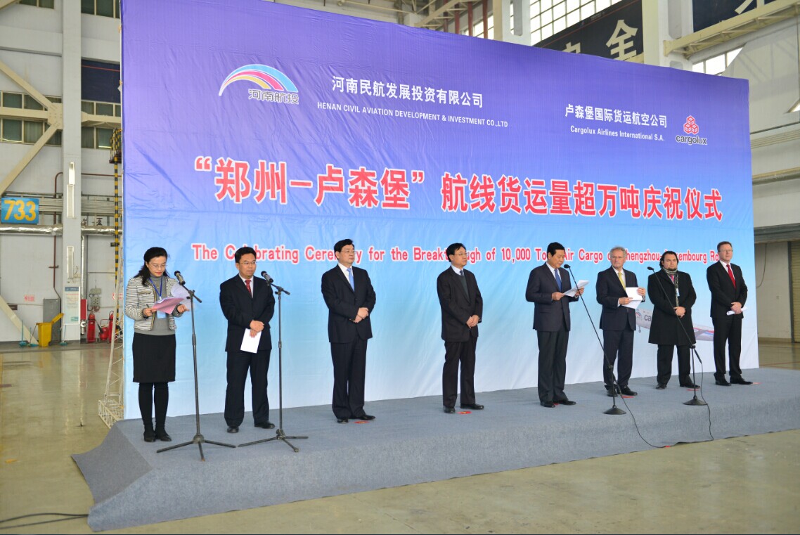 河南省副省长赵建才参加仪式并致辞,他指出,“郑州-卢森堡”国际货运航线架起了横贯中欧大陆的“空中丝绸之路”。“一路飞跨中欧,天堑变通途”,截至今日,该航线累计货运量已突破万吨,为郑州国际机场货运量的快速提升作出了突出贡献!这一成绩的取得,是河南省与卢货航优势互补、合作共赢的成功典范,更是“双枢纽”战略推动实验区发展的生动实践。当前,郑州航空港经济综合实验区发展态势良好,希望卢货航与河南航投抢抓实验区战略机遇,不断拓宽合作领域,丰富合作内容,加快推动合资货航组建和飞机维修基地建设,积极培育参与国际分工合作新优势,努力促进郑州与卢森堡乃至欧亚之间的经贸合作和人文交流,为建设郑州航空港经济综合实验区做出新的更大的贡献。