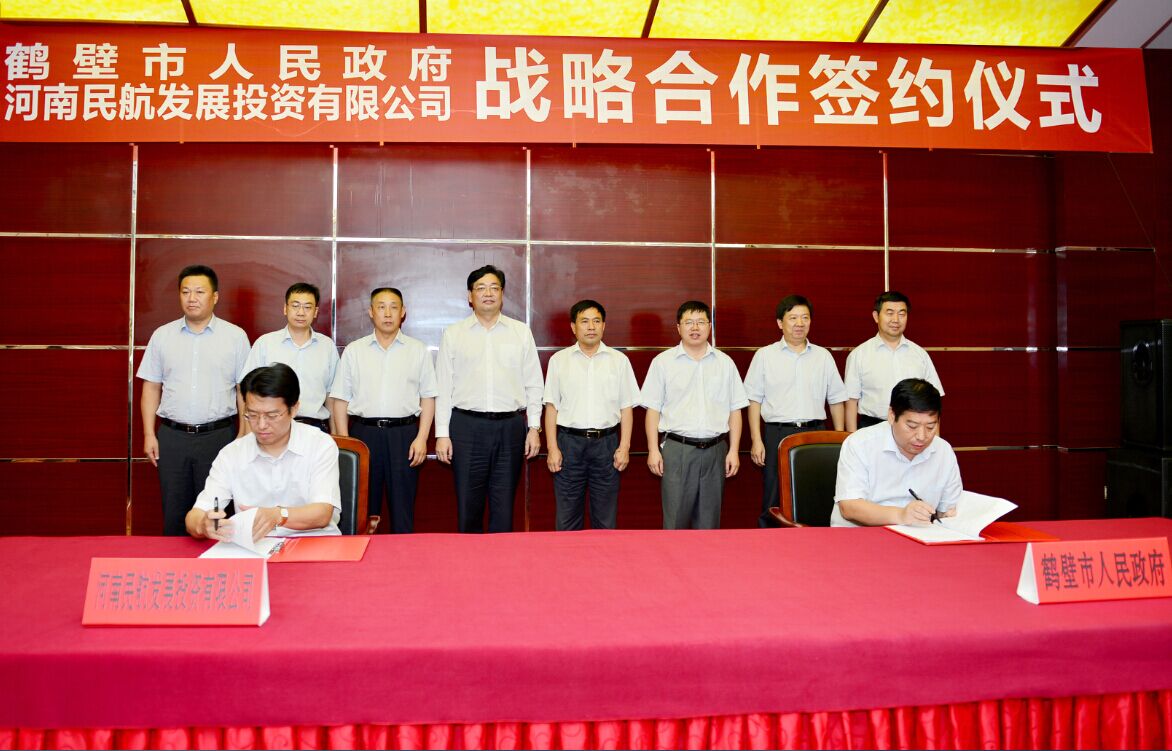 9月2日,河南航投与鹤壁市人民政府战略合作签约仪式在鹤壁市举行。河南航投董事长、党委书记张明超,总经理、副董事长、党委副书记刘建葆,副总经理悦国勇及相关业务负责人;鹤壁市委书记范修芳,市长唐远游,市委常委、常务副市长史全新,市委常委、副市长于燕,市委常委、市委秘书长李成宽,市政府秘书长许新房、副秘书长裴文顺出席仪式。张明超与唐远游分别致辞。悦国勇、史全新代表双方签署《战略合作协议》,仪式由于燕主持。