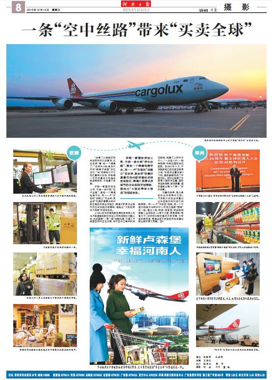 在8次报道中,既有会前的“热身”宣传,又有会中的集中点击,还有会后的回顾追踪,形成系列,精彩纷呈。13日,《河南日报》以图文并茂的整版篇幅,对河南航投与卢货航的合作,尤其是“新鲜卢森堡”双向跨境E贸易进行了详细报道。整个报道以新闻摄影为主,既有卢货航“郑州号”波音747-8F全货机,也有郑-卢航线的专业操作流程展示,还有河南百姓采购“新鲜卢森堡”商品的真实场景……以郑卢“双枢纽”为典型案例,围绕“一条‘空中丝路’带来‘买卖全球’”这一主题,生动展现了河南省依靠蓝天对外开放的新思路和新成就。