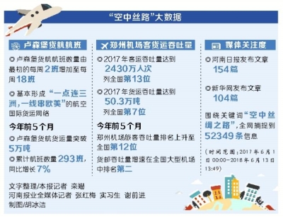 2017年6月14日,国家主席习近平在会见卢森堡首相贝泰尔时,明确提出要深化双方在“一带一路”建设框架内金融、产能等合作,中方支持建设郑州—卢森堡“空中丝绸之路”。