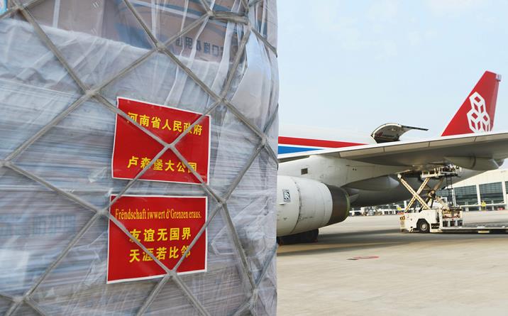 2020年2月,疫情爆发初期,卢森堡货航和河南航投共同积极加入抗“疫”战斗,除了为中国员工提供口罩、消毒棉片、防护服等物资支援外,还在原定的春节假期期间,加运了95吨医疗物资驰援中国抗“疫”一线,并根据国内外市场的需要有序增加运力。当年3月,河南省委、省政府为卢森堡紧急筹措了包括4500件医用防护服、50万只医用外科口罩、5700只医用N95口罩、10万双医用手套、600只额温枪、2万瓶洗手液、1080副医用护目镜等在内的首批医疗物资,并通过郑州—卢森堡货运航班直接运抵卢森堡。郑卢“空中丝绸之路”被卢森堡政府誉为“卢森堡及其他欧洲地区的生命线,是一条雪中送炭的空中桥梁。”在这条丝路的连接下,豫卢双方成为共建共享、休戚与共的“一家人”。